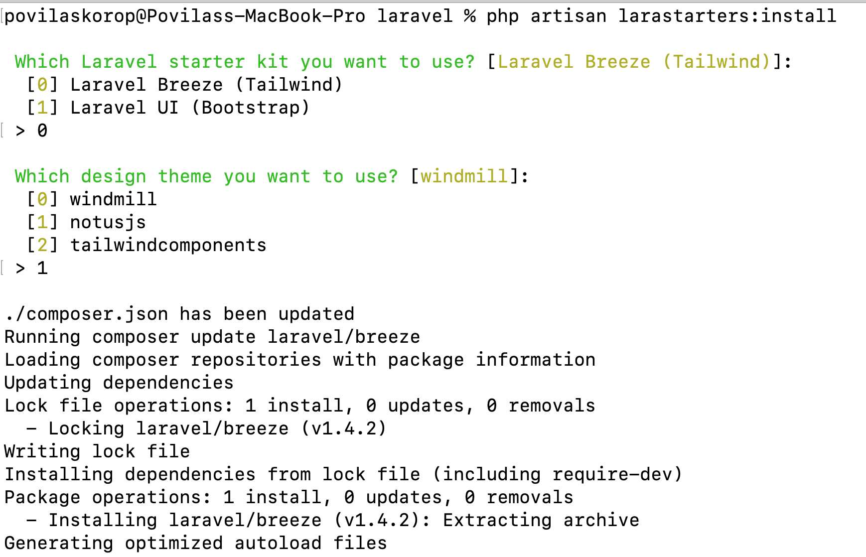 php artisan larastarters:install- it will show a wizard to choose the starter kit and the theme (options are listed below)Run